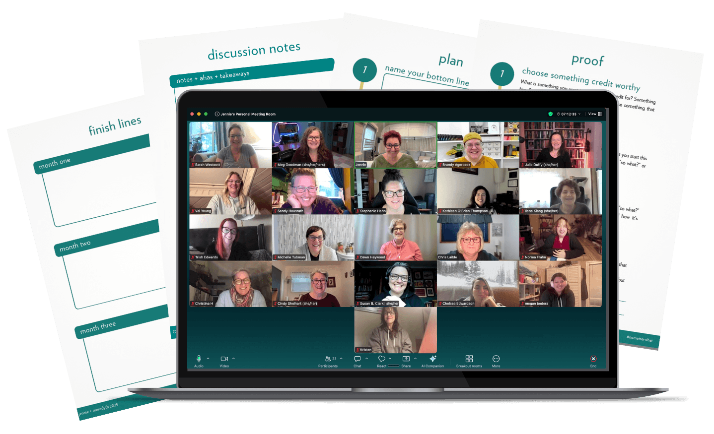 If you choose the solo track, your camera is your call during the solo work blocks — but we still expect you to be all in, not multitasking. (Bathroom breaks are always allowed, of course.) Either way, you will be expected to shut down distractions, dive in, get vulnerable, be brave, and accept accountability on your #nomatterwhat commitments.